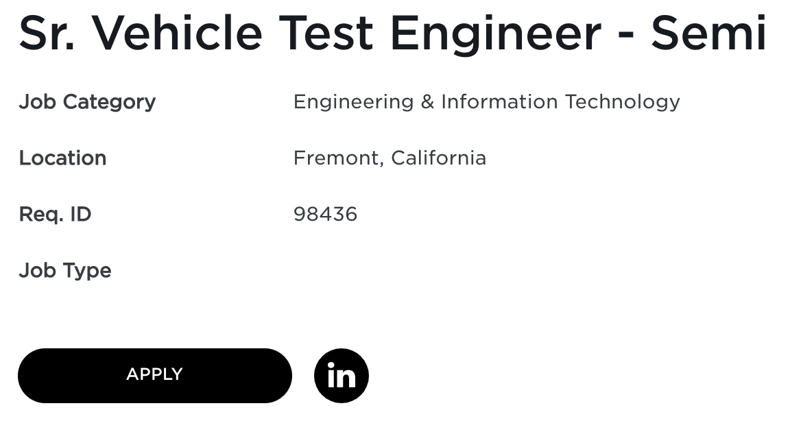 There is also a “Sr. Vehicle Test Engineer – Semi” that will “develop and execute vehicle testing for Semi and various platforms.”