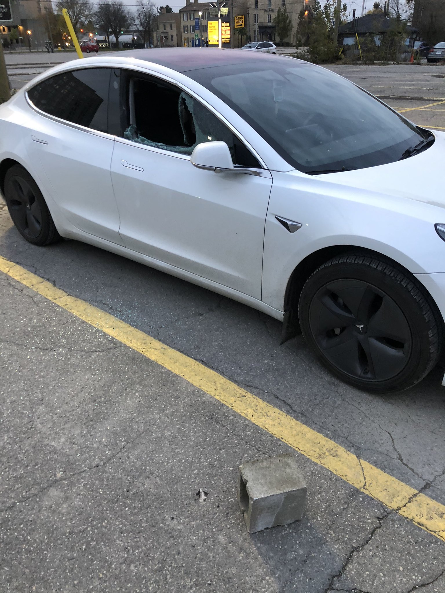 The act of senseless vandalism occurred on October 29, 2020 in London, Ontario in a parking lot at 74 Fullerton Street. The Model 3 owner Ken, tells Drive Tesla his car had been parked there overnight, something which he had done many times before without incident.