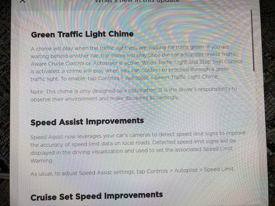 Gone are the days of not noticing when a light turns green! According to the release notes, your car will now play a chime when a traffic light you are waiting for changes to green. If you are behind a vehicle the chime will activate when it proceeds. This will happen if you are the one driving, and you have no driver-assist features turned on.