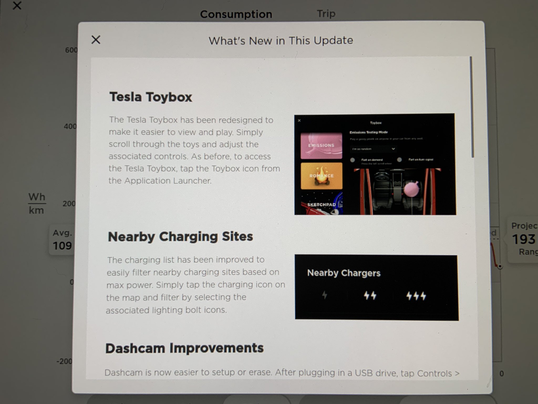 The Tesla Toybox has been redesigned to make it easier to view and play. Simply scroll through the toys and adjust the associated controls. As before, to access the Tesla Toybox, tap the Toybox icon from the Application Launcher.