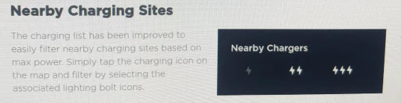 The charging list has been improved to easily filter nearby charging sites based on max power. Simply tap the charging icon on the map and filter by selecting the associated lighting bolt icons.