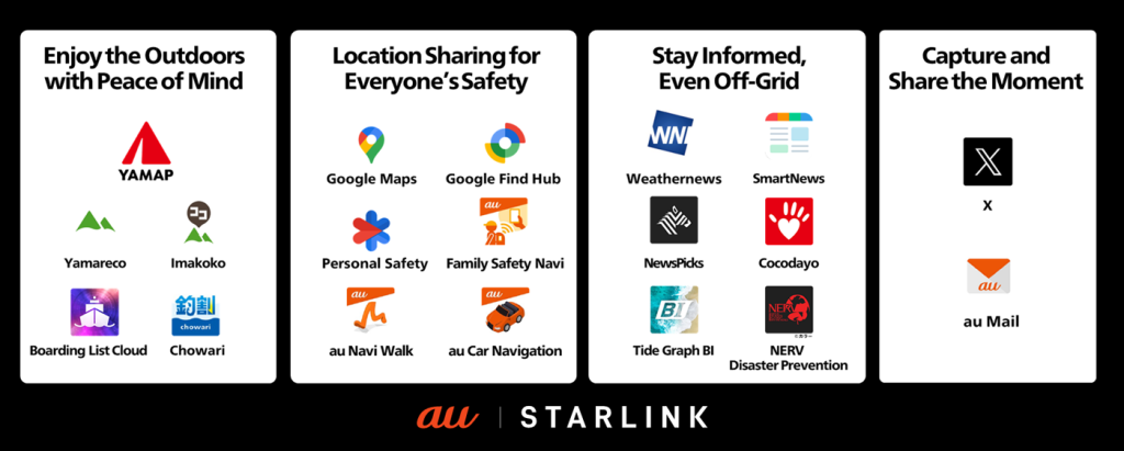 Supported apps in the first rollout include Google Maps, Weathernews, NERV Disaster Prevention, YAMAP hiking maps, SmartNews, and X, making the service particularly valuable for people in rural areas, hikers, and emergency responders.
