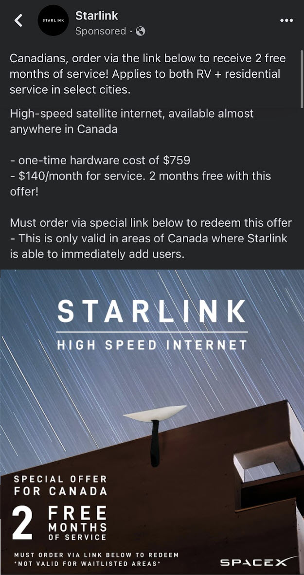 Now the company is advertising on Facebook, promoting an offer for Canadian residents where you can get two free months of Starlink service. A Starlink subscription in Canada costs $140 per month, so this works out to a $280 savings.