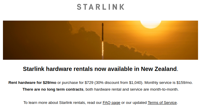 SpaceX is making it easier for customers in New Zealand to sign up for Starlink. The company is now allowing subscribers to rent their Starlink hardware on a monthly basis, making it just the second time SpaceX has made this rental offer in as many weeks. For those customers that would prefer to purchase their hardware outright SpaceX is also offering a 30% discount.