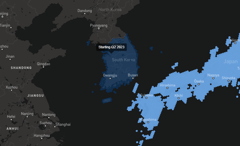 This timeline matches that of the official Starlink availability map which shows a planned launch date of Q2 2023 in South Korea.
