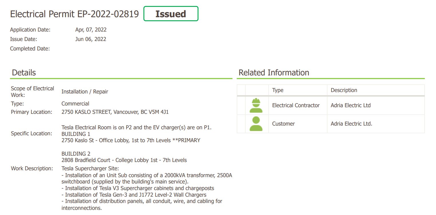 Last week Tesla accidentally revealed the addresses of all “coming soon” Supercharger locations around the world. The accidental leak lasted only a few hours, but it was long enough for us to capture all of the new addresses, including one for East Vancouver, British Columbia.