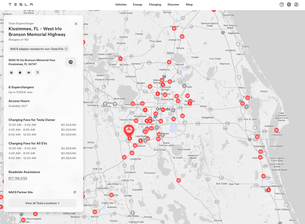 The Kissimmee location features eight charging stalls and becomes the fourth “true” V4 Supercharger in the United States to pair V4 posts with upgraded V4 power cabinets. At this particular station, Tesla owners can charge for $0.40/kWh during peak periods, dropping to $0.20/kWh off-peak, while non-Tesla EV drivers pay $0.56/kWh, or $0.28/kWh during off-peak hours.