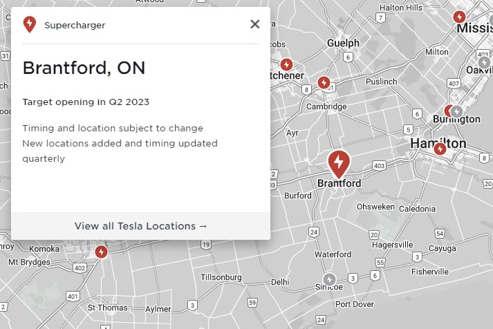 Brantford was only added as a potential location last month during Tesla’s quarterly map update. According to Tesla it is scheduled to open in Q2 2023, but given that construction has already started and Supercharger equipment is already on-site, this station should hopefully open before the end of 2022.