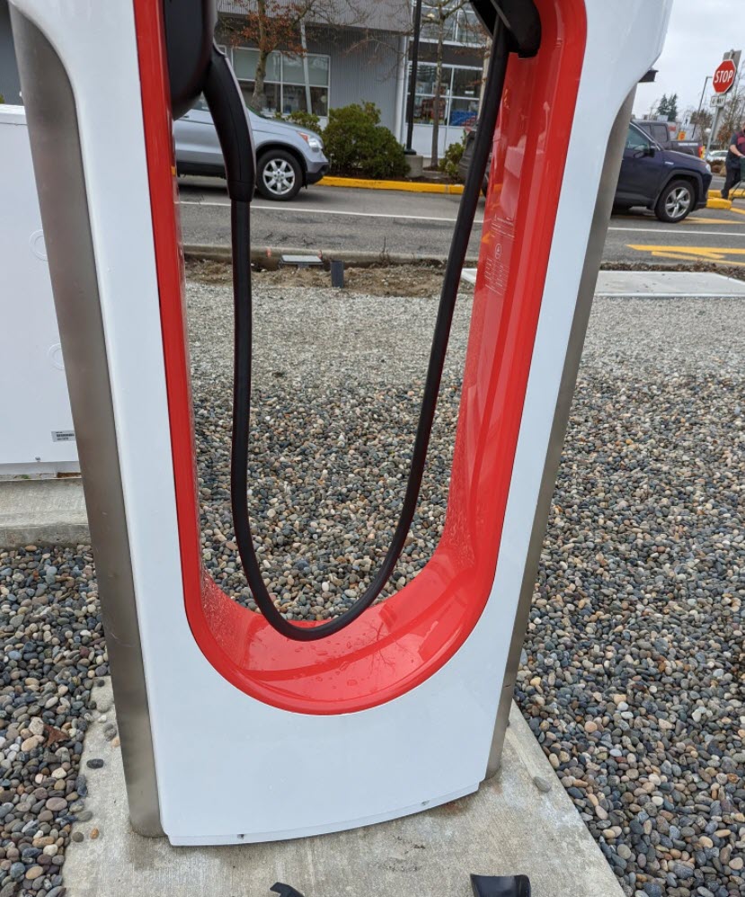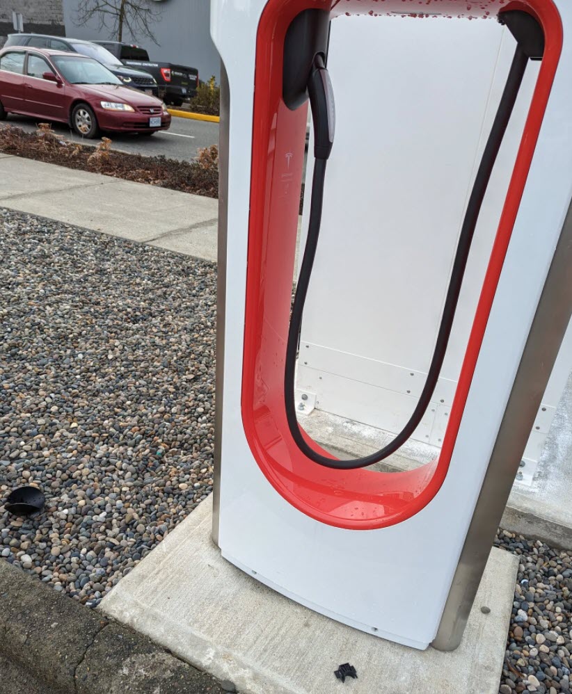 Drive Tesla reader Kyle Conway shared these photos with us showing the charging cables have been cleanly cut just inches from where they come out of the pedestal.