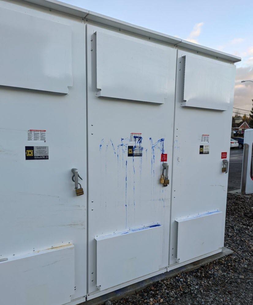 This isn’t the only vandalism the site has suffered this week. Photos shared on the TMC forum by joshuajag on Monday show the utility equipment had been tagged with graffiti and the plastic covers surrounding the charging cables and connectors had been forcibly removed.