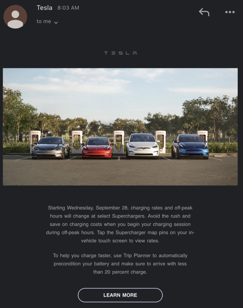 According to an email sent to owners in California, the new charging rates and off-peak hours are effective starting today, September 28. The email doesn’t state what the exact changes are as they vary from station to station, but owners are reporting fee increases at their local Superchargers, while at some, fees have actually decreased under the new tiers.