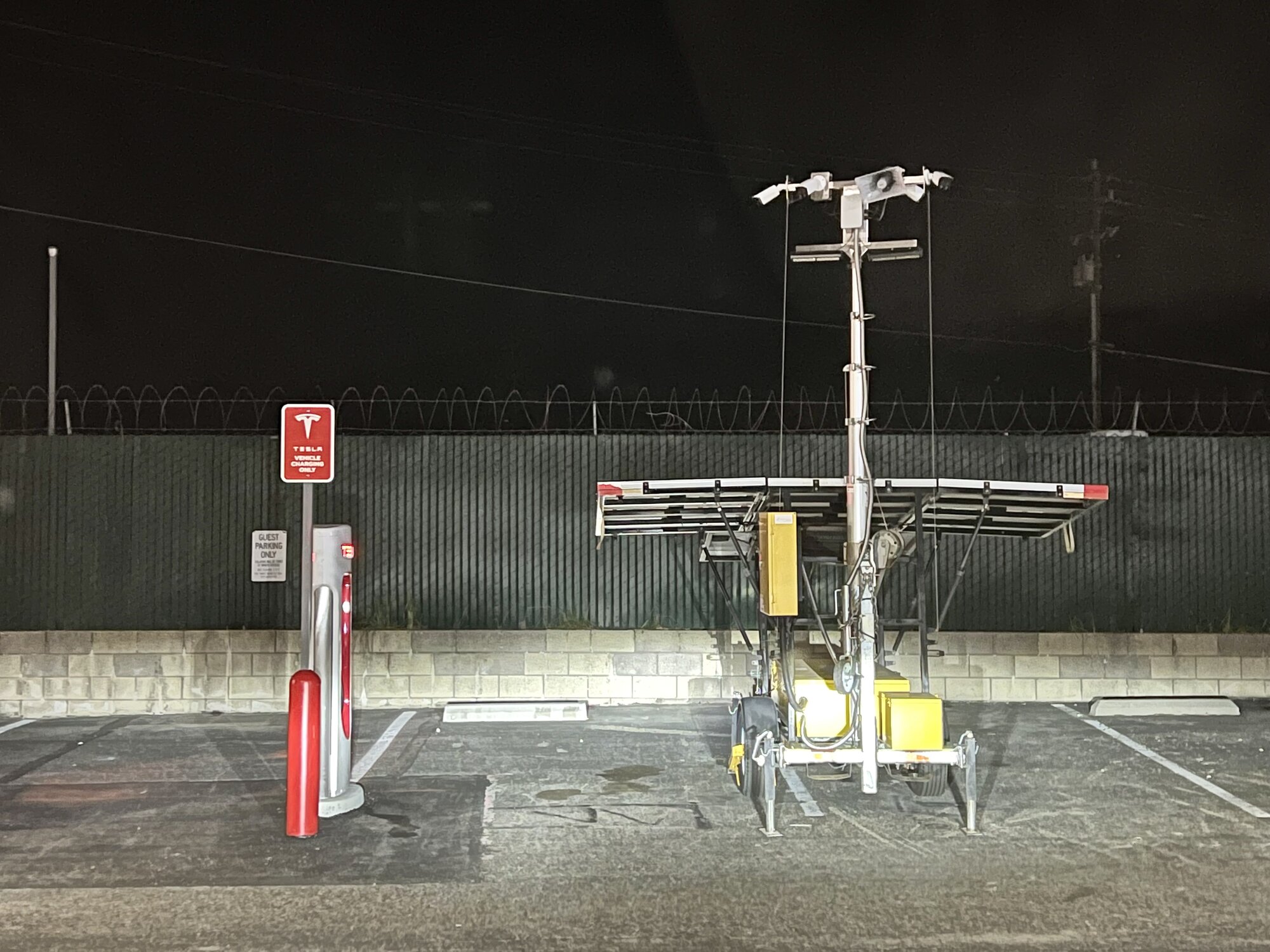 UPDATE Feb 8 8:15am PST: In some good news, Tesla has already been able to repair and reopen the station. They also added a new feature – a solar powered mobile security system complete with cameras and alarms. Hopefully that doesn’t get stolen now…