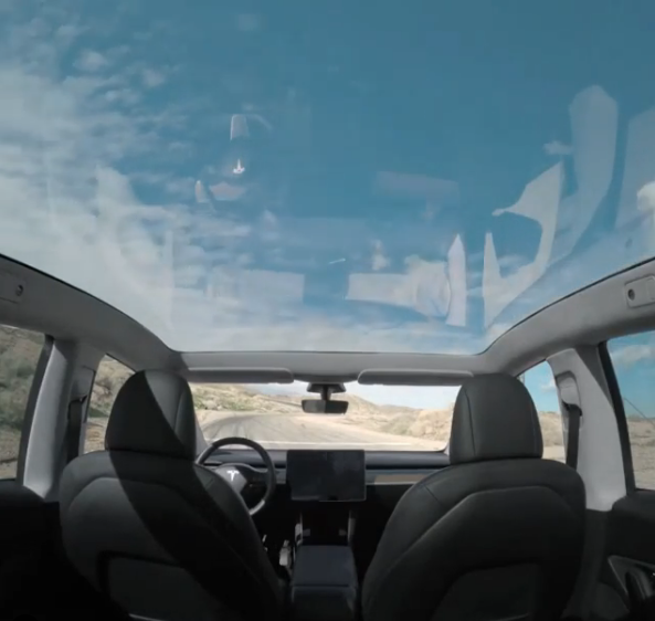 The front row resembles the Model 3, but once you get into the back seats, the differences between the Model 3 and Model Y begin to emerge. Hughes said that while “the front really looks like the same size as the 3, the back is a whole different story”. Part of what makes the interior feel so large is the panoramic glass roof, which unlike its sibling Model 3 has no center beam and the glass extends all the way from front to back.