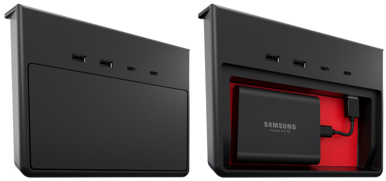 The bundle includes the Jeda USB Hub, which is the perfect accessory to organize and de-clutter your center console. It allows you to use up to five different devices for charging and data purposes: two front USB-A and two USB-C connectors and a vertical USB-A connector inside a special compartment for Dashcam storage. The unique design creates a minimal and tidy space for you to safely store important data while maintaining an OEM look and feel. The interior of the Jeda USB Hub is lined with a soft silicone backing, while the exterior boasts a velvet-like feel.